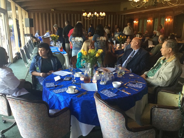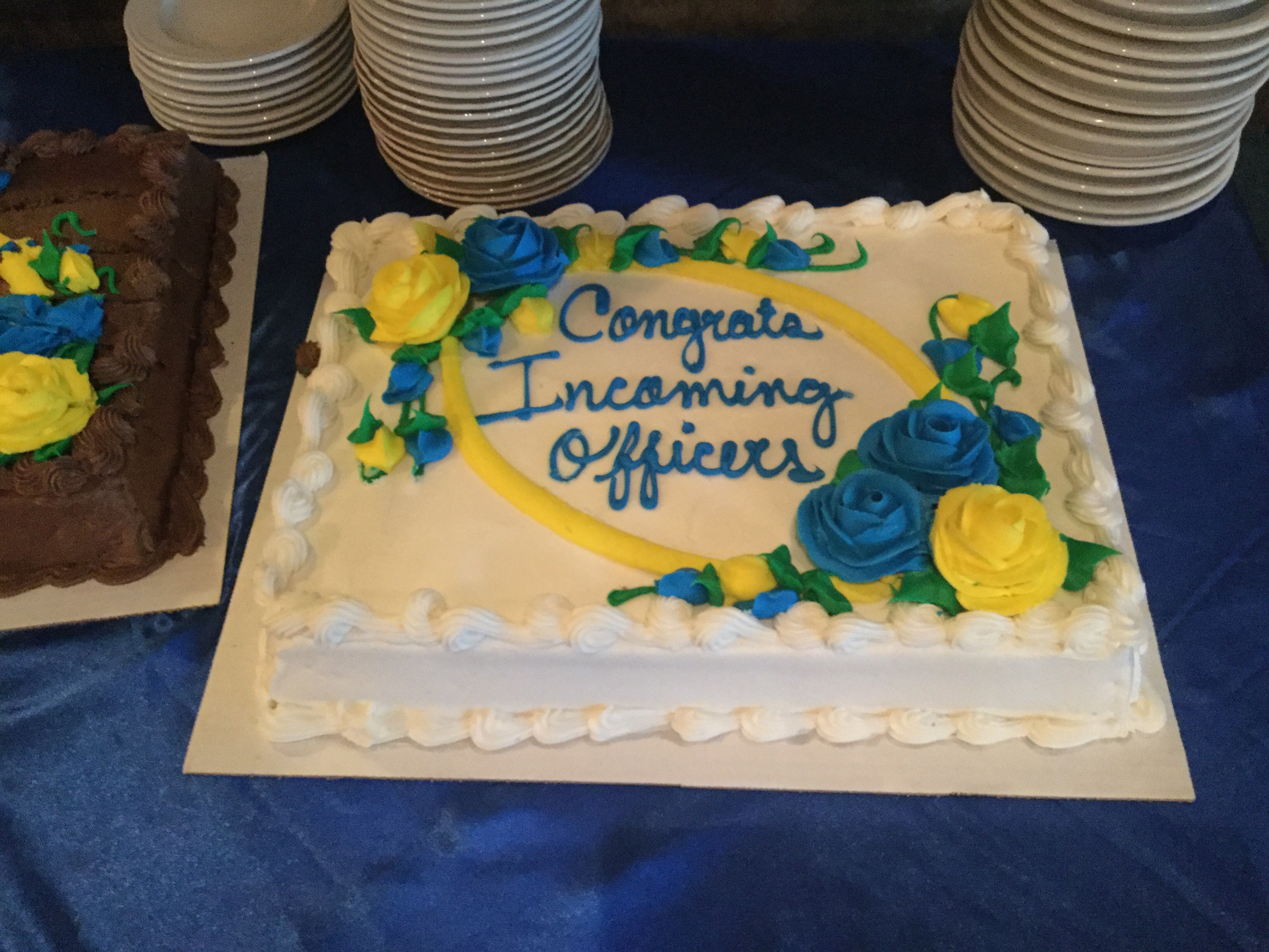 As a designer, the jobs where clients have grand dreams but also have a great budget may seem to be the most exciting……and for the most part, I might agree. However, in my world I am often asked to do grand things on a small budget. I’ve gotten quite good at this and even might admit to enjoying the challenge. In April the Kiwanis Club of San Bernardino hosted the Division 36 Council Meeting of Kiwanis at Arrowhead Country Club and needed an impactful yet simple table decor on a shoestring budget. Carrie to the rescue! Using the color scheme of Kiwanis (blue and gold/yellow), I created a very simple design using yellow roses, royal blue pintuck linens and white/royal blue damask napkins that simply popped. Even the cakes I ordered matched. The simple design of the arrangements allowed each female guest to remove a rose and take it home with them. A lovely gesture. AND the money saved on such an event helps the San Bernardino club to keep their funds for things like student scholarships and clothing and school supplies for underprivileged children. Truly a win-win.
