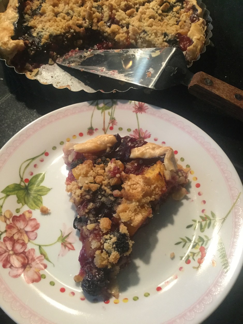 I don’t know about you, but I always need something sweet with my savory for breakfast! That yin and yang of flavors on my tongue is what satisfies me the most. Today I threw together this tart at the last minute. It really is super easy and takes very little time. The result is something that looks impressive; like you spent hours making it, and tastes delightful and fresh. I happened to have the ingredients on hand. I had one frozen roll out pie crust and bits to fruit that needed to be eaten – you know how you end up with one of things and no one eats them and they sit and rot? Well, not today. I used up the last large peach, large mango, and the leftover fresh blueberries. You can use just about any fruit you have. Viola! a fancy tart for breakfast.